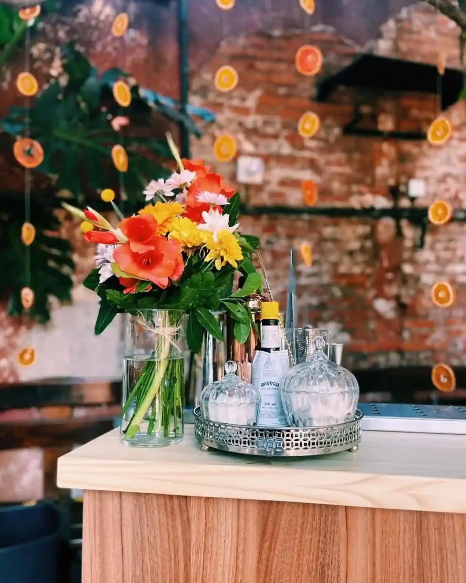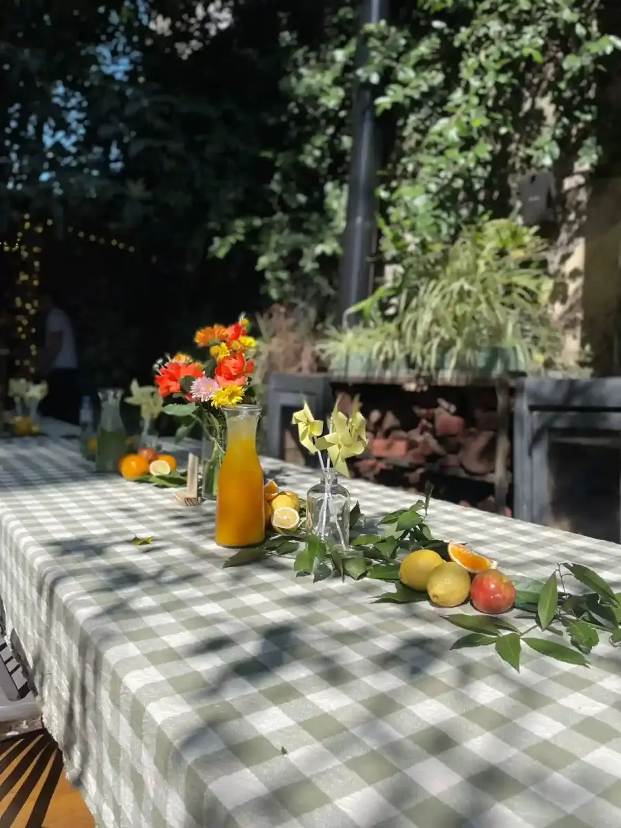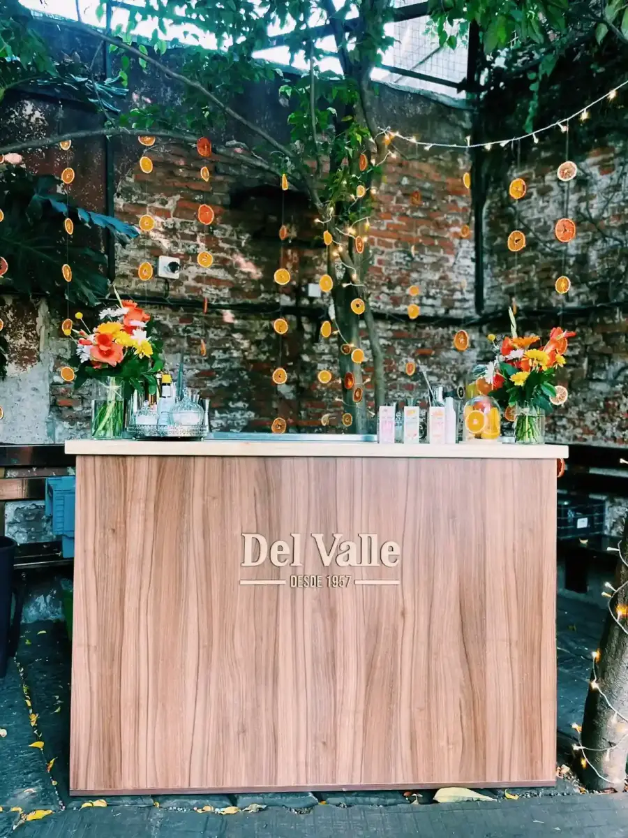 Para esta propuesta, armamos una mesa estilo banquete, con aires de picnic, que daba cuerpo al espacio, con un camino central de frutas y flores que aportaron texturas y color. Realizamos una barra de madera y una estación de exhibición de productos, destacando los jugos en un entorno natural y descontracturado.