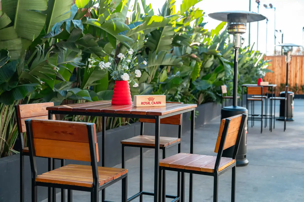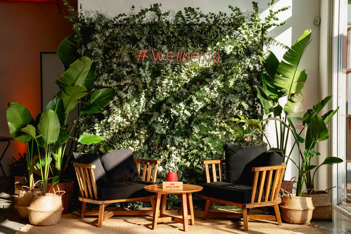 Planteamos livings de madera para transmitir calidez y naturalidad, sumamos un photo opportunity enmarcado en vegetación y canastos de fibras naturales que aportaron textura a la ambientación.