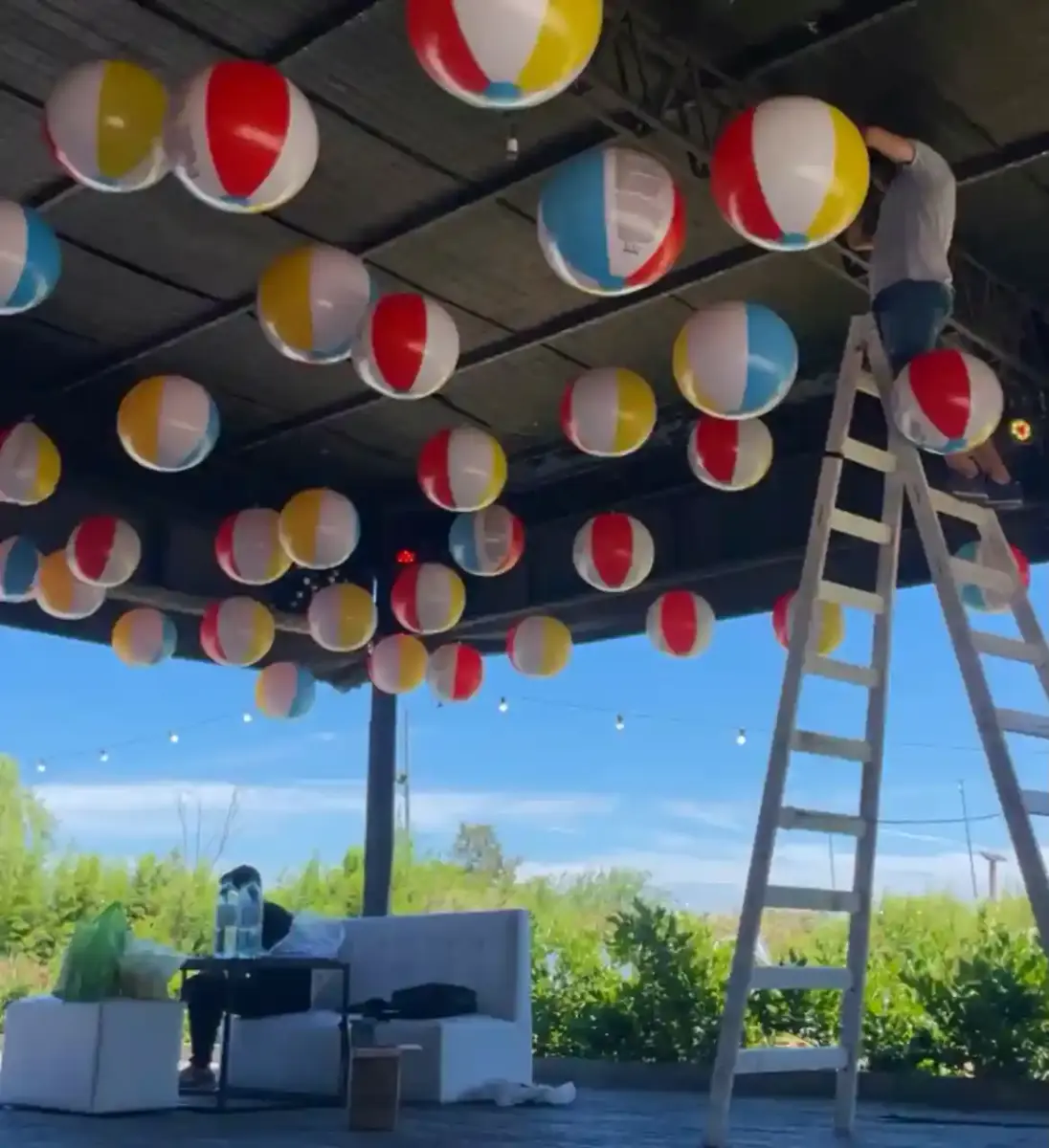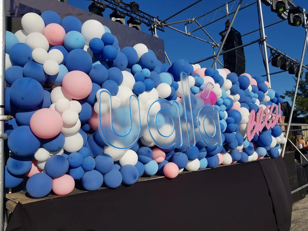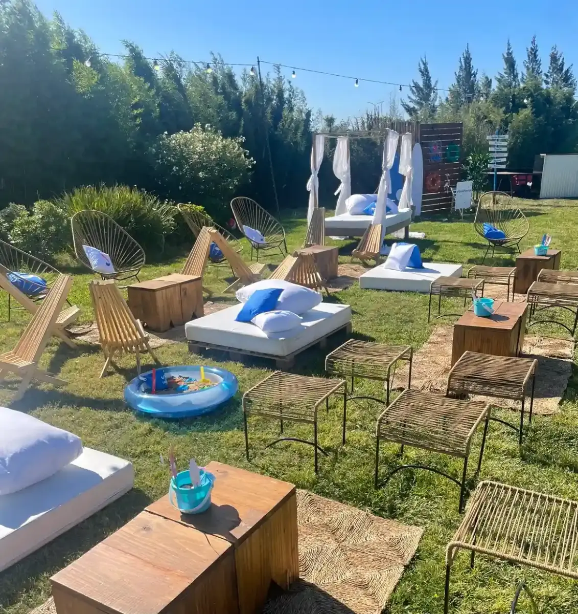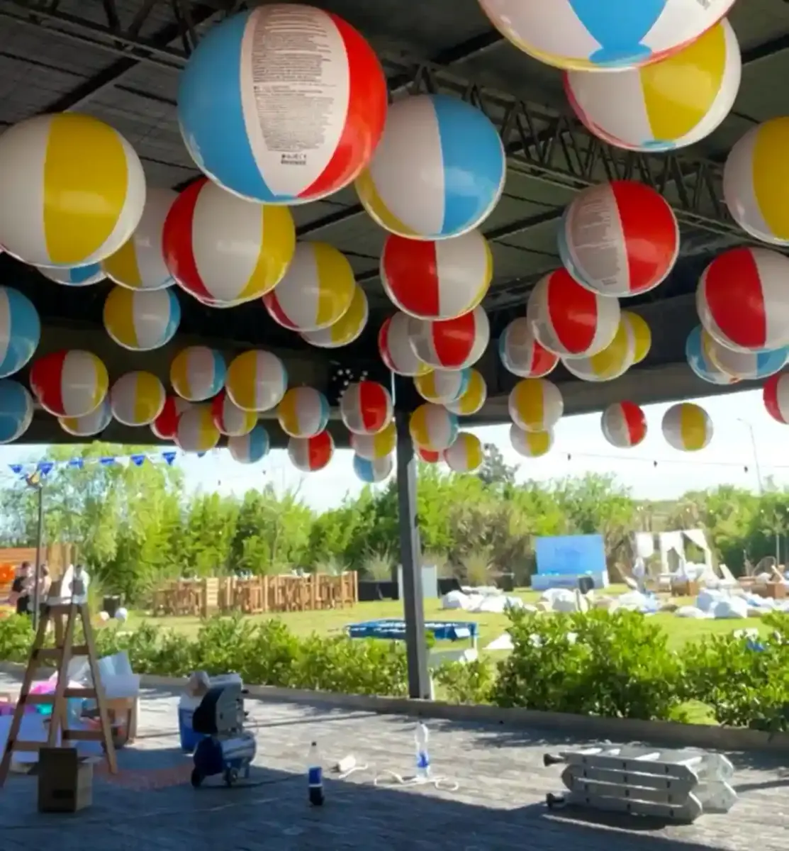 El mobiliario bajo de madera, con sillas playeras y una estética rústica, invitaba al descanso y a la conversación en un ambiente relajado. Generamos dos photo opportunities: un pelotero con neón y un back con props que recreaban un día de playa. Además, sumamos un frente de globos para el escenario y la cabina del DJ.