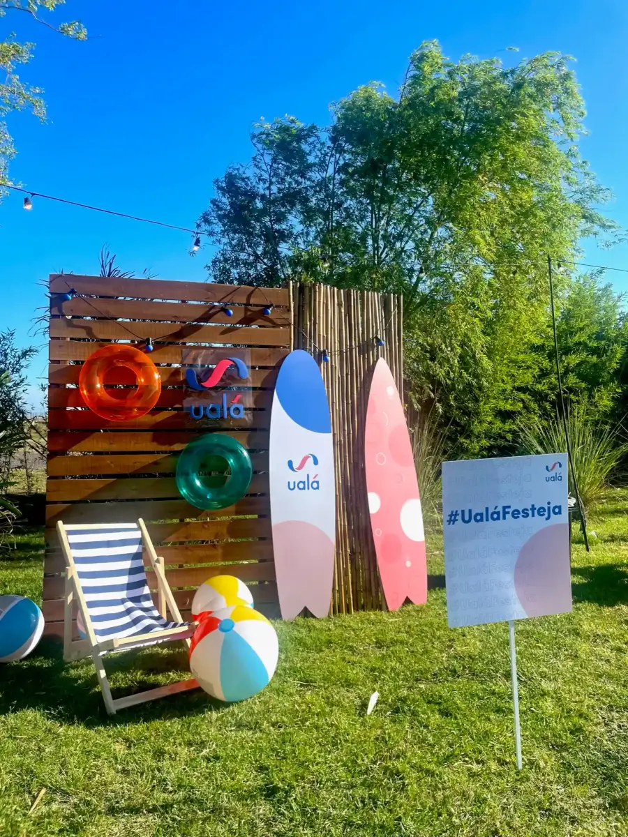 Junto a Mucha Productora, realizamos la ambientación integral para la fiesta de fin de año de Ualá. Diseñamos un espacio con estética playera, combinando comodidad y diversión en cada sector.